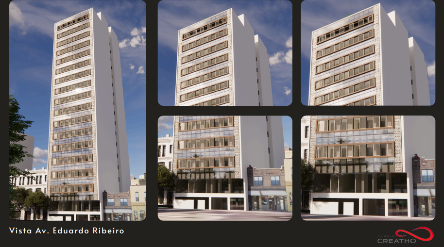 O térreo contará com áreas comerciais, biblioteca, recepção e espaço administrativo, enquanto os andares superiores abrigarão as unidades residenciais.
